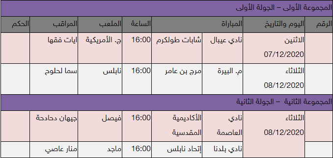 القدس – الحياة الجديدة - أعلن الإتحاد الفلسطيني لكرة القدم، اليوم الأربعاء، عن جدول مباريات الجولة الأولى من الدور الأول لبطولة كأس رئيس الاتحاد للأندية النسوية، والتي تقام بالتعاون مع الاتحاد الياباني لكرة القدم، وذلك على النحو الآتي: