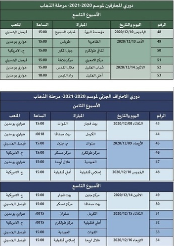 القدس – الحياة الجديدة - أعلن الاتحاد الفلسطيني لكرة القدم، اليوم الخميس، عن جدول مباريات الأسبوع التاسع من دوري المحترفين، والأسبوعين الثامن والتاسع من دوري الدرجة الأولى "الاحتراف الجزئي" بعد التعديل، على النحو الآتي:
