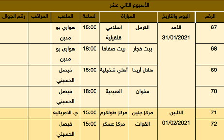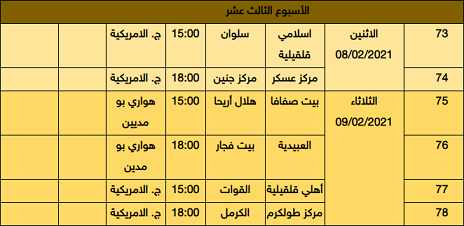 القدس – الحياة الجديدة - أعلن الاتحاد الفلسطيني لكرة القدم، اليوم الأربعاء، عن جدول مباريات الأسابيع الثلاث الأولى (12 و13 و14) من مرحلة الإياب في دوري المحترفين والدرجة الأولى (الاحتراف الجزئي)، على النحو الآتي: