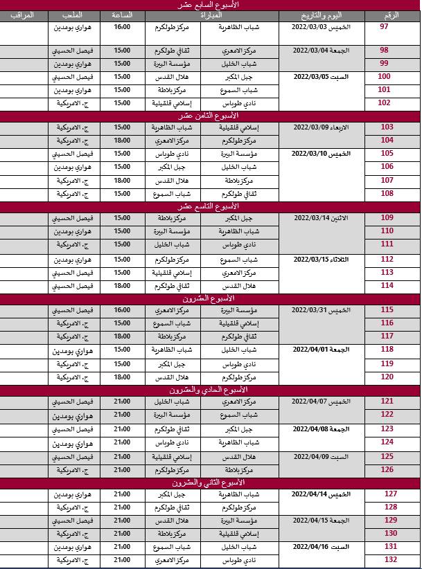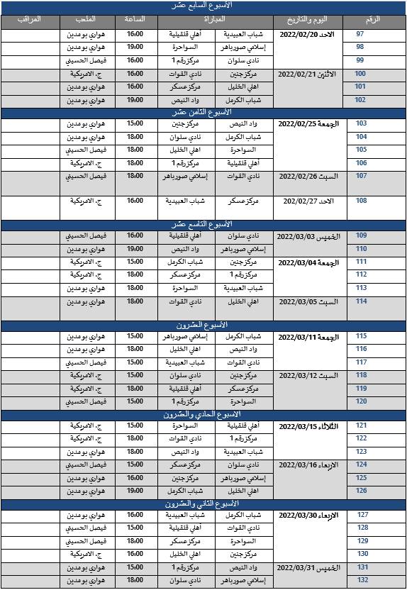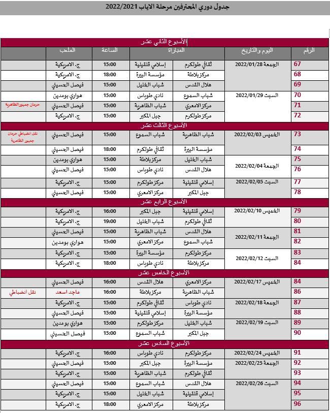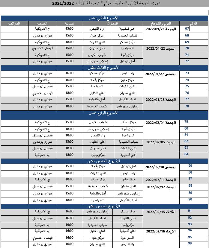 القدس- وفا- أعلن الاتحاد الفلسطيني لكرة القدم، اليوم الأحد، عن جدول مباريات مرحلة الإياب من دوري المحترفين، ودوري الدرجة الأولى (الاحتراف الجزئي)، على النحو الآتي: