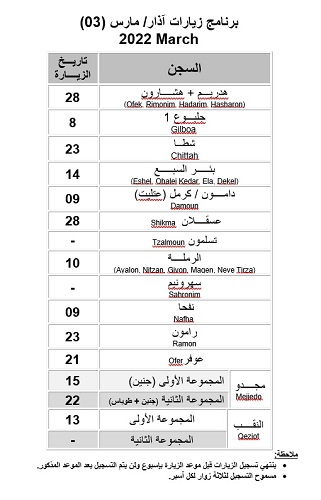 جنين – الحياة الجديدة - أعلنت اللجنة الدولية للصليب الأحمر، اليوم الأحد، عن برنامج الزيارات العائلية لأسرى محافظتي جنين وطوباس لشهر آذار المقبل، على النحو التالي:
