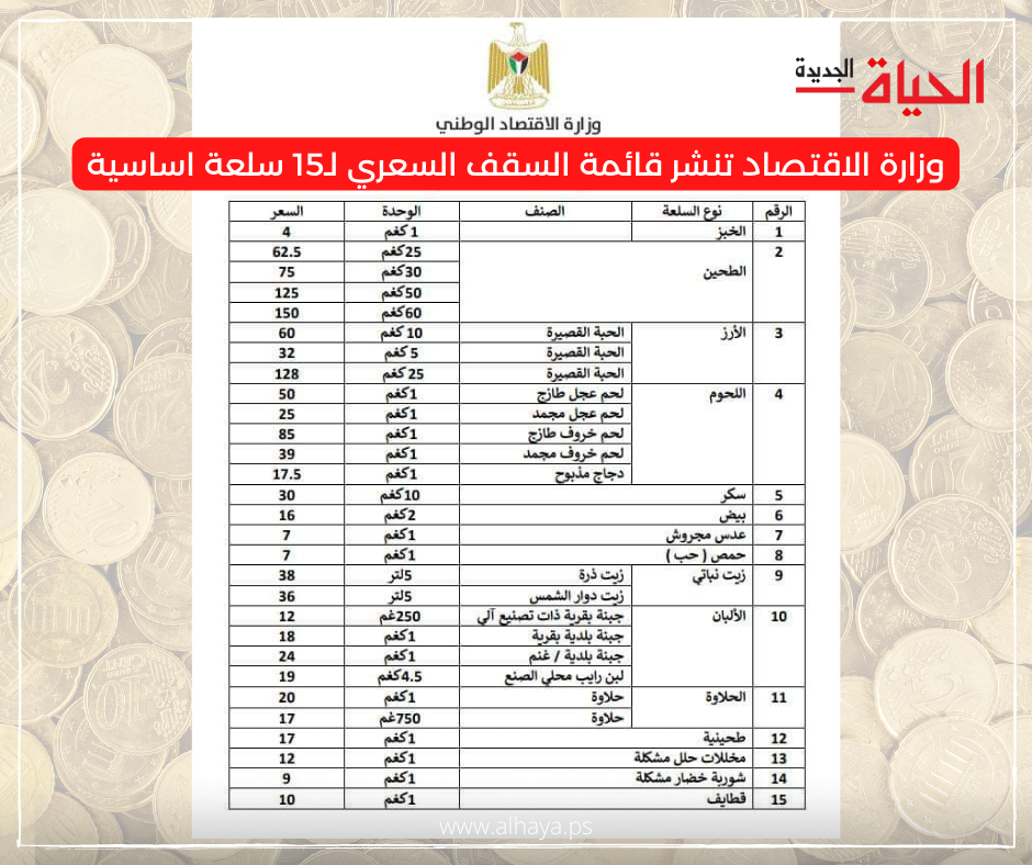 رام الله- الحياة الجديدة- نشرت وزارة الاقتصاد الوطني، اليوم الاحد، قائمة السقف السعري الاسترشادي الاعلى للمستهلك، التي تضم 15 سلعة أساسية تتفرع إلى أصناف، تمثل الأكثر استهلاكا في سلة المستهلك خلال شهر رمضان المبارك.