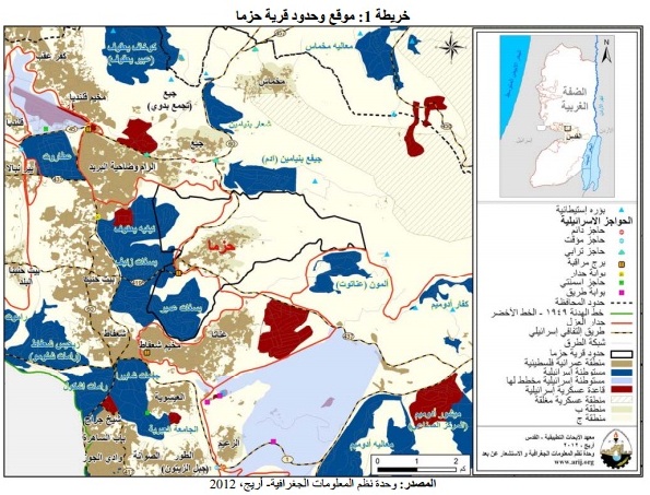 قادة الاحتلال وجنوده يعتبرون أن المشكلة في حزما سببها رشق مركبات المستوطنين بالحجارة، ويتناسون بان المشكلة الاكبر تتمثل في وجود هؤلاء المستوطنين في الضفة الذين يعمدون في اطار مخططات الاحتلال الى احاطة التجمعات السكانية بمستوطناتهم وشق طرقهم على حساب اراضي المواطنين، فمساحة  بلدة حزما باتت تضيق على سكانها بعد ان عزل الجدار الفاصل (4318 دونما) من اراضي القرية عن اصحابها، حيث يقدر طول الجدار العنصري المقام على الجهة الغربية والجنوبية للبلدة بـ(5) كيلو مترات، في حين تحاصر القرية في جهتها الشمالية باسلاك حديدية، ما يعني ان هدف الاحتلال بعيد المدى يتمثل في محاصرة البلدة والحد من نموها وتمددها الطبيعي في حين يتاح للمستعمرات الاستيطانية في تلك المنطقة بالتمدد التوسع.