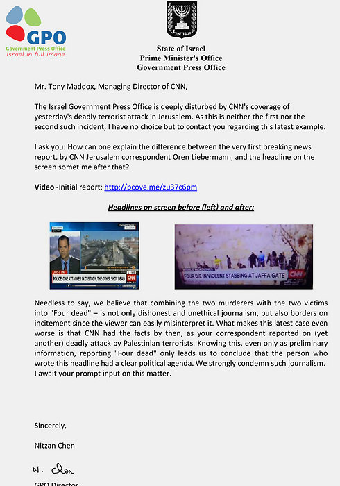 أرسل مكتب الإعلام الحكومي الإسرائيلي رسالة إلى كل من شبكة سي إن إن، وسي بي إس، اشتكى فيها فشل الشبكتين بالتمييز بين القتلى (ضحايا ومهاجمين) في العملية الأخيرة بالقدس، وجاء في الرسالة أنه وبكل بساطة تم الإعلان عن 4 قتلى في الهجوم.