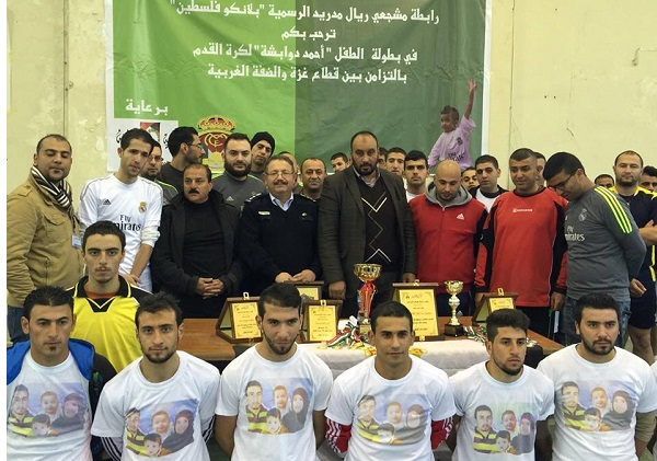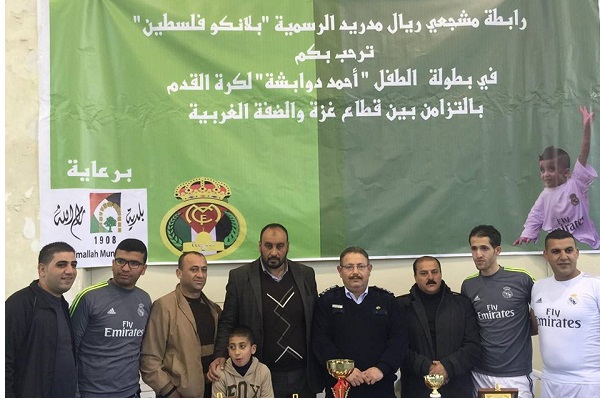 البيرة- بناء على توجيهات سيادة اللواء حازم عطا الله مدير عام الشرطة كرم العقيد بسام جبر رئيس الإتحاد الرياضي للشرطة عائلة دوابشة وذلك ضمن بطولة الطفل أحمد دوابشة لخماسيات كرة القدم والتي أقيمت يوم الجمعة الموافق 25/12/2015 في صالة ابسا الرياضية بمدينة البيرة والتي نظمها رابطة مشجعي ريال مدريد الرسمية ( بلانكو فلسطين ) بالتزامن بين قطاع غزة والضفة، حيث شارك في البطولة عشر فرق من مختلف المؤسسات الأهلية الفلسطينية .