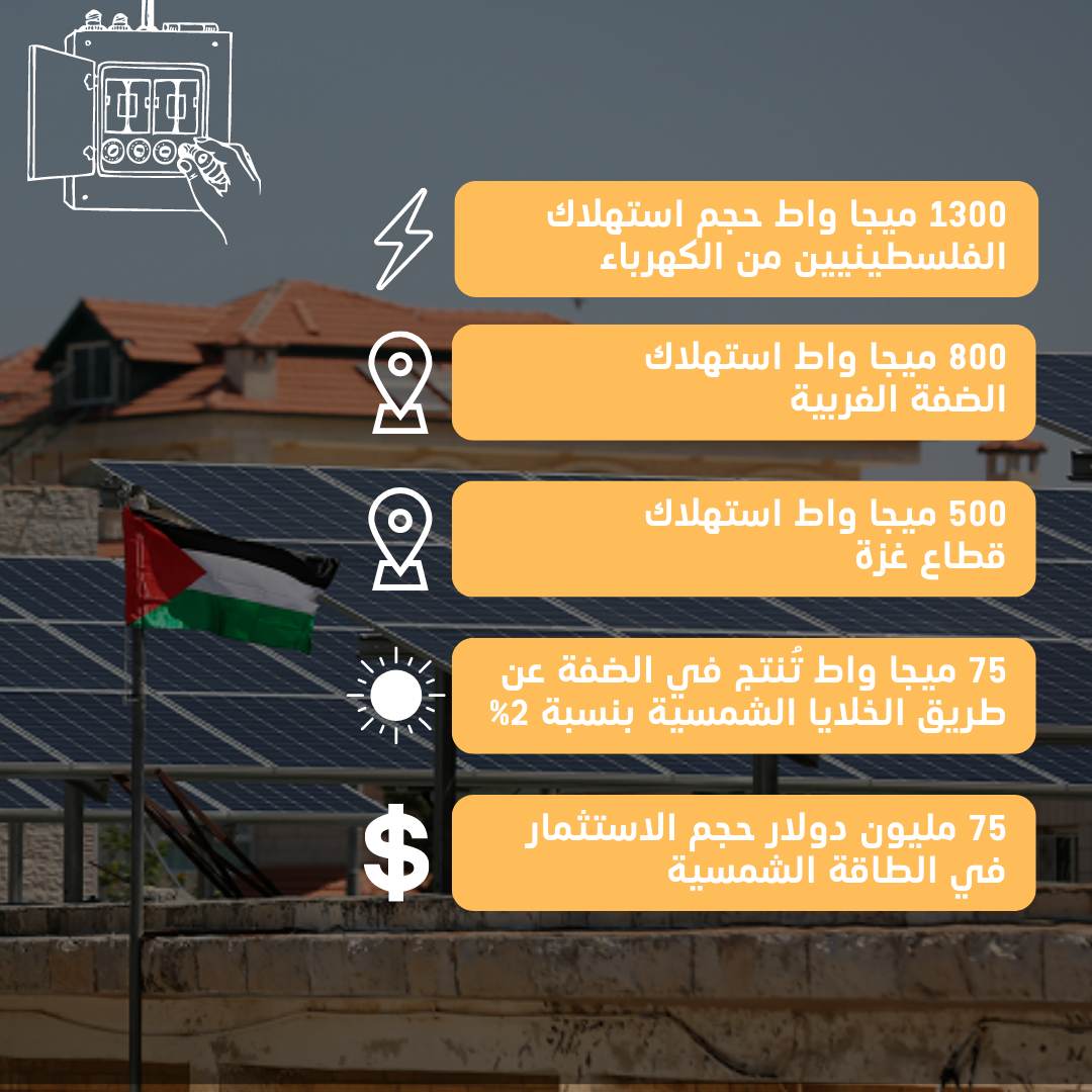ويبلغ استهلاك الكهرباء في الضفة الغربية وقطاع غزة نحو 1300 ميغاواط، 800 ميغاواط منها في الضفة، و500 ميغاواط في غزة، وتأتي معظم هذه الإمدادات من إسرائيل التي تفرض أسعار الكهرباء، حسب إحصائيات لعام 2017، فهل تولّد مشاريع الألواح الشمسية بصيص أمل للفلسطينيين على طريق الخلاص من التبعية لإسرائيل؟! الأمر يحتاج تكثيف جهود الجميع بين القطاعين العام والخاص، بالإضافة للقبول المجتمعي لهذه المشاريع.