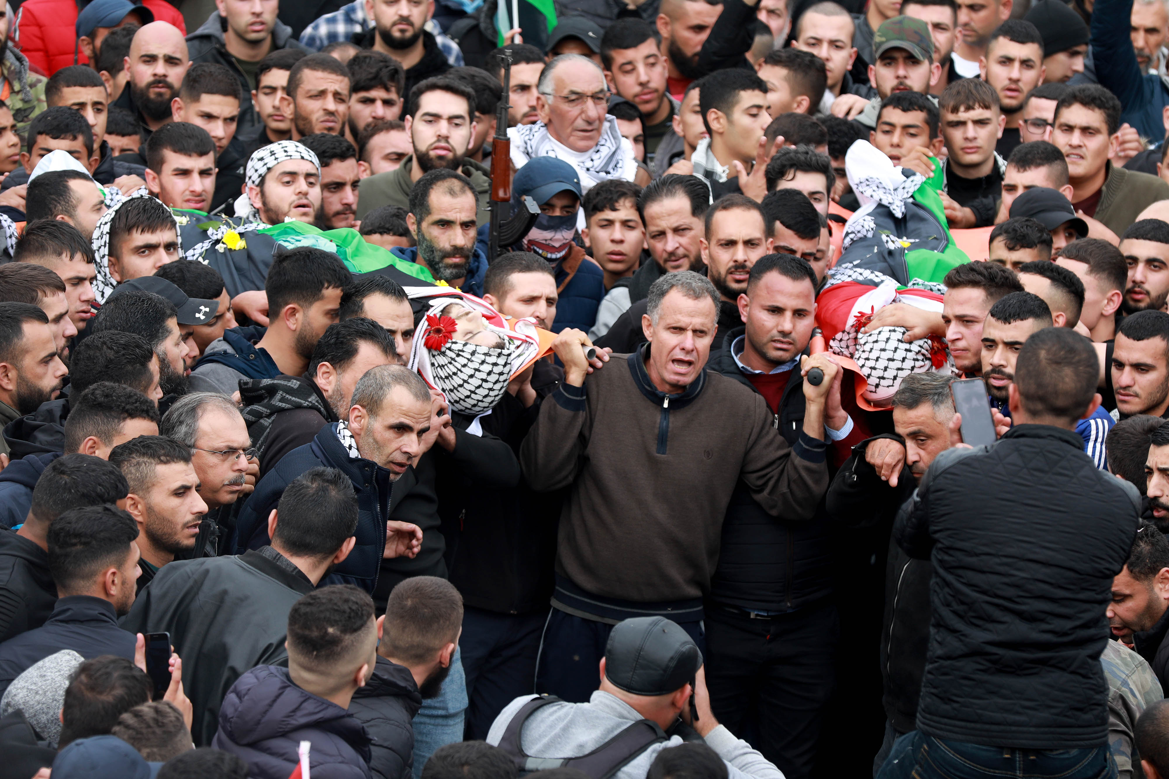 وجاب المشيعون شوارع البلدة، رافعين العلم الفلسطيني، ومرددين الهتافات الغاضبة والمنددة بالجرائم التي يرتكبها الاحتلال الإسرائيلي بحق أبناء شعبنا، ومن ثم أدوا صلاة الجنازة على الجثمانين قبل مواراتهما الثرى.