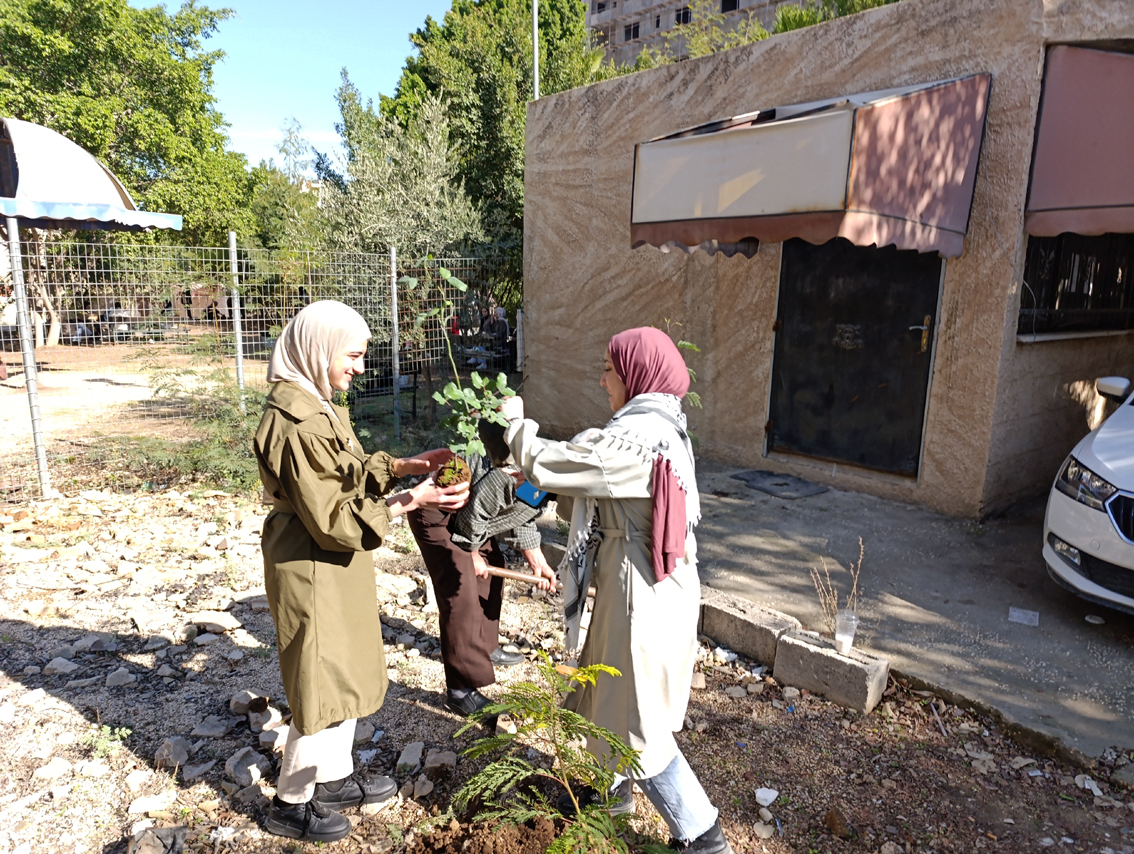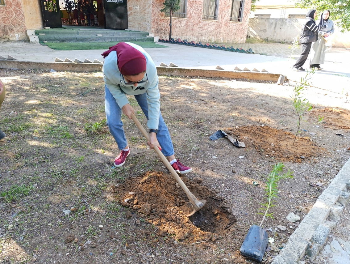 وأخذ مدير التوجيه السياسي والوطني، بشار جالودي، يعد برفقة طالبات حفرا لغرس أشجار خروب وغار ونباتات زينة، ويشجع المتدربات على العودة إلى الأرض، واستثمار كل حيز متاح في حديقة الجامعة وبيوتهن.