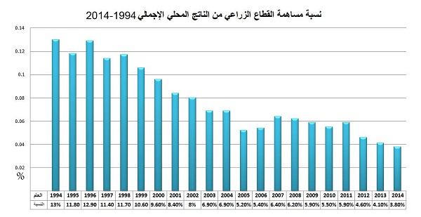 وتبين الاحصائيات ان الناتج المحلي الاجمالي زاد اربعة أضعاف ونصف منذ عام 1994 حيث كان 2.8 مليار دولار، حتى عام 2014 حيث أصبح الناتج المحلي الاجمالي 12715 مليار دولار، في المقابل زادت قيمة الانتاج الزراعي من 377 مليون دولار بعد عشرين عاما الى 494 مليون دولار، بمعنى أنه لم يتجاوز في نموه ضعفا واحدا على الأقل.