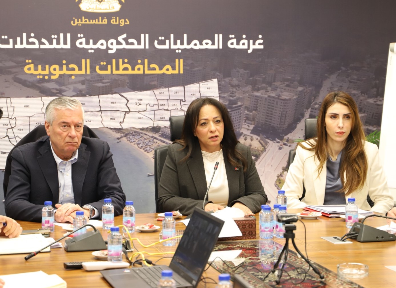 اجتمعت غرفة العمليات الحكومية للتدخلات الطارئة في المحافظات الجنوبية، برئاسة وزيرة التنمية الاجتماعية والإغاثة سماح حمد، وبحضور وزيرة العمل إيناس العطاري، ووزير الصناعة عرفات عصفور، إلى جانب ممثلين عن القطاع الخاص، منهم رئيس المجلس التنسيقي للقطاع الخاص إبراهيم برهم، ورئيس اتحاد الصناعات الفلسطينية نصار نصار، ورئيس اتحاد الغرف التجارية عبده إدريس، ورئيس اتحاد المقاولين أحمد القاضي، ورئيس المجلس التنسيقي فيصل الشو، الذي شارك عبر تقنية "زووم" من غزة.