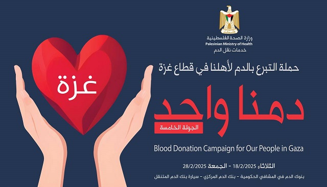 ودعت الوزارة المواطنين في المحافظات الشمالية للتبرع بالدم خلال الحملة التي ستنطلق بعدَ غدٍ الثلاثاء وتستمر حتى يوم الجمعة 28 شباط/ فبراير الجاري، في بنوك الدم كافة في المستشفيات الحكومية وبنك الدم المركزي برام الله.