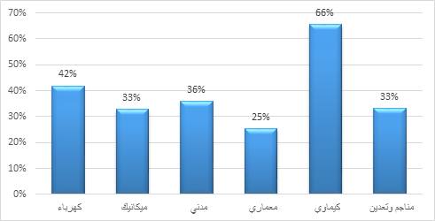 وكشفت الدراسة إلى ارتفاع نسبة البطالة في صفوف المهندسين الكيماويين بنسبة 66% فيما شكلت نسبة البطالة في تخصصات الهندسة الكهربائية والميكانية ما نسبته 37.5%، وتنخفض نسبة البطالة في تخصص الهندسة المعمارية نظرا لضبط اعداد الخريجين في هذا القطاع.