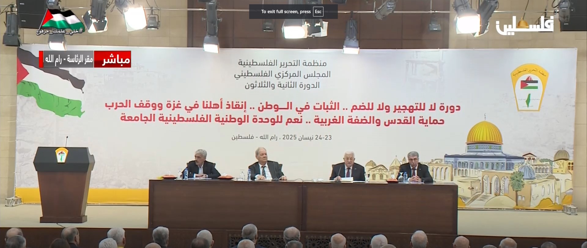 نلتقي اليوم تحت راية فلسطين الواحدة، راية منظمة التحرير الفلسطينية، الممثل الشرعي والوحيد للشعب الفلسطيني، نلتقي في لحظة تاريخية حساسة وفارقة، نُواجه فيها مخاطر جمّة، هي أقرب ما تكون إلى نكبة جديدة تُهدد وجودنا، وتُنذر بتصفية قضيتنا الوطنية كلها، تنفيذاً لمخططات من صنعوا نكبة شعبنا الأولى منذ وعد بلفور عام 1917، إلى اقتلاع أكثر من نصف الشعب الفلسطيني من وطنه التاريخي خلال نكبة 1948، وصولاً إلى نكبة عام 1967، وبعد ذلك نكبة "الانقلاب" الآثم في عام 2007، الذي استخدمه عدونا لتمزيق نسيجنا الوطني، ولمنع قيام دولتنا المستقلة.