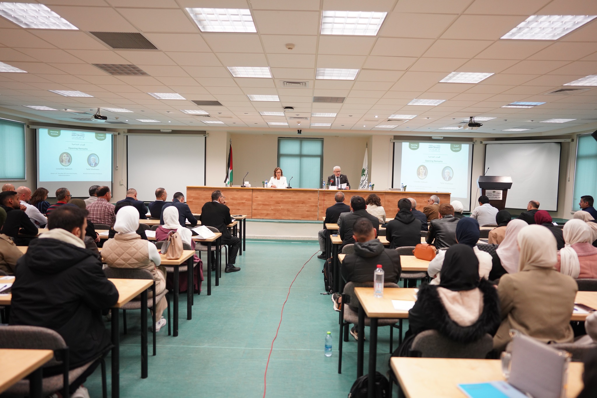 وقال رئيس جامعة بيرزيت، طلال شهوان، في كلمته الافتتاحية: اليوم هو الرقم 577 من العدوان والإبادة التي يتواصل روتينها البشع في بث مباشر أمام مرأى الإنسانية على شكل متوالية من المجازر المفزعة في مرحلة حالكة من التاريخ البشري.
