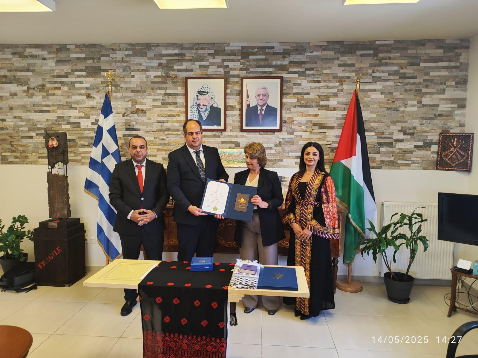 أثينا- الحياة الجديدة - نيابة عن رئيس دولة فلسطين محمود عباس، منح سفير دولة فلسطين لدى اليونان يوسف درخم الأكاديمية والمترجمة اليونانية بيرسا كومونيتسي، وسام الثقافة والعلوم والفنون (مستوى الإبداع)، لدورها في خدمة القضية الفلسطينية.