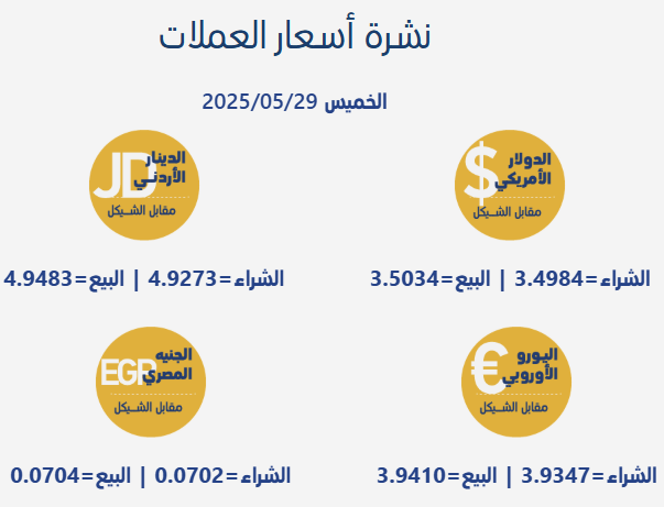 رام الله- الحياة الجديدة- جاءت أسعار صرف العملات مقابل الشيقل، اليوم الخميس، بحسب سلطة النقد الفلسطينية، على النحو التالي: