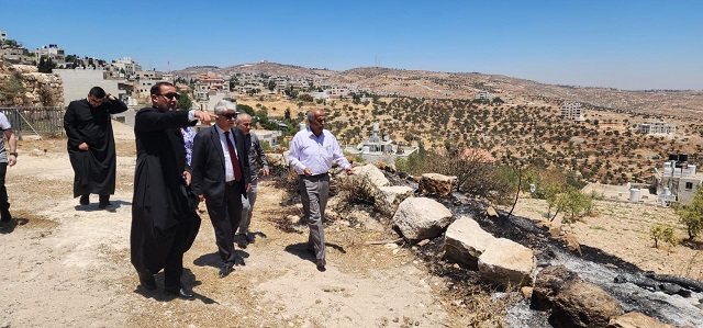 وكان في استقبال الوفد راعي كنيسة المسيح الفادي للاتين، الأب بشار فواضله، ورئيس بلدية الطيبة سليمان خوريه، والناشطة المجتمعية مريم البصير، الذين أطلعوا الزائرين على تفاصيل الاعتداءات الأخيرة التي طالت أراضي ومقدسات البلدة، خاصة الحريق المتعمد الذي اندلع مؤخرًا قرب كنيسة الخضر الأثرية والمقبرة المجاورة، وكاد أن يتسبب بكارثة لولا تدخل الأهالي وطواقم الإطفاء.