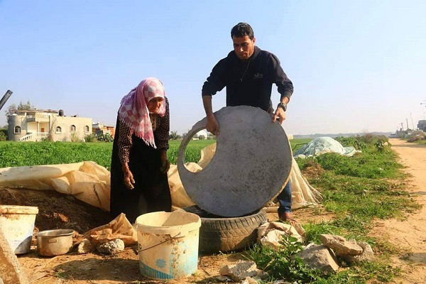 أم رائد التي تعمل في صنع الأفران الطينية لتوفير مصدر دخل لعائلتها القاطنة بقرية خزاعة الحدودية شرق مدينة خان يونس.