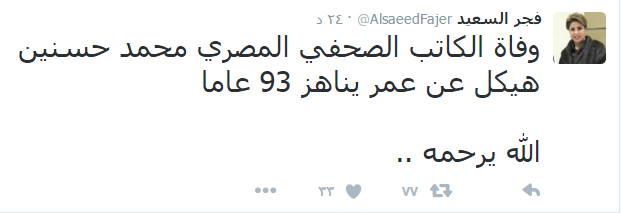 وكتبت السعيد، عبر حسابها الرسمي على موقع "تويتر" : "وفاة الكاتب الصحفي المصري محمد حسنين هيكل عن عمر يناهز 93 عاما، الله يرحمه".