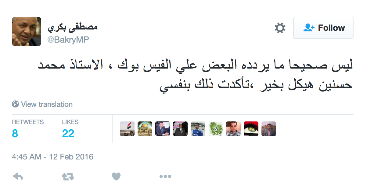 وقال بكري عبر حسابه الشخصي على "تويتر": "ليس صحيحاً ما يردده البعض على الفيس بوك، الأستاذ محمد حسنين هيكل بخير، تأكدت من ذلك بنفسي".