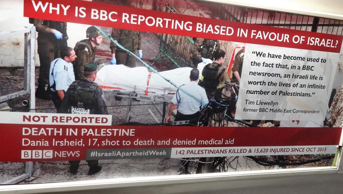 وأشارت في أحد الملصقات إلى ميول هيئة الإذاعة البريطانية (BBC) إلى تحسين صورة إسرائيل في تقاريرها وعدم نشر الحقيقة، وكتب على الملصق 'يبدو أن في غرفة الأخبار التابعة لهيئة الإذاعة البريطانية تعتبر حياة الإسرائيليين أهم من حياة الفلسطينيين'.