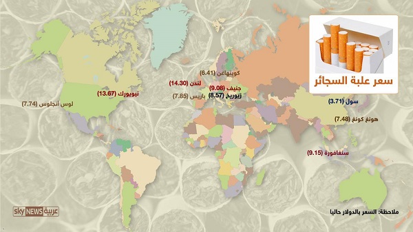وأما السجائر، فإن شراء علية سجائر في لندن سيكلف المرء غاليا، إذ يصل سعر العلبة فيها إلى 14.3 دولار، بينما كان العام الماضي 14.92 دولار، أرخص مدينة من المدن العشرة في سعر السجائر هي سول، حيث يبلغ سعر علبة السجائر فيها 3.71 دولار مقابل 2.69 العام الماضي.