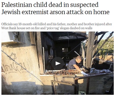 الجارديان البريطانية، كان لها منحى آخر، ووضعت خبر الجريمة  في الصفحات الداخلية واستخدمت كلمات حيادية باهتة تحت عنوان "وفاة طفل فلسطيني في هجوم حرق متعمد لمشتبه بهم من المتطرفين اليهود على منزل". مستبعدة في ذلك العنوان أي حديث عن جريمة حرق متعمد أو حتى عن قتل باستخدامها كلمة "وفاة".