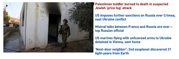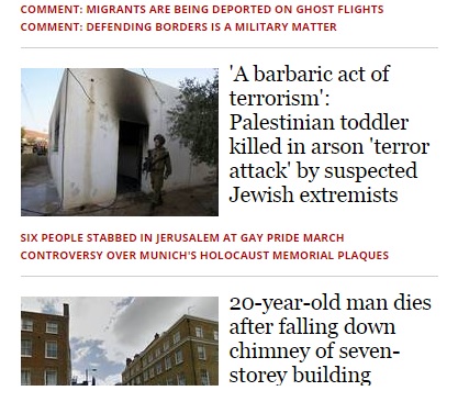 بينما وضعت صحيفة لوموند الفرنسية على صفحتها الرئيسية خبر مع صورة لجدران منزل عائلة دوابشة المتفحمة من الداخل تحت عنوان "طفل فلسطيني قُتل في حريق، يشتبه بأن منفذيه متطرفون إسرائيليون".
