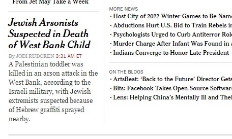 وبدت لغة صحيفة نيويورك تايمز الأميركية أكثر بروداً، فوضعت خبراً صغير المساحة على الصفحة الأولى دون صورة مصاحبة للعنوان "مشتبهون يهود في هجوم بإشعال حريق أدى إلى مقتل رضيع فلسطيني في الضفة الغربية".