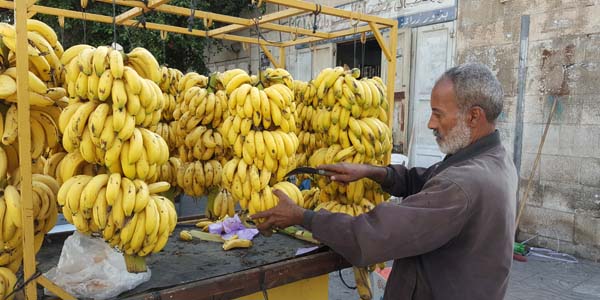 وسط المدينة يصرخ تجار عربات الموز طوال النهار (ابو نملة) الثلاثة بعشرة ، فيما الموز الاسرائيلي كل اربعة كيلو منه او حتى خمسة كيلو بعشرة شواقل، والمستهلك لا يعنيه نوع الموز، ما يعنيه هو ما سيقوم بدفعه من جيبه.