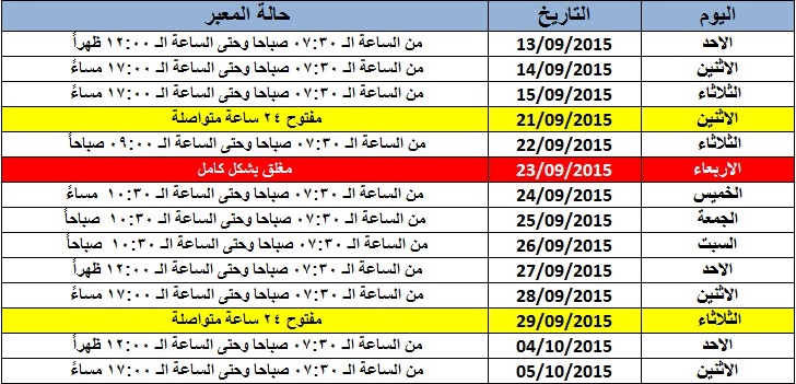 رام الله - الحياة الجديدة - أعلن مدير عام الإدارة العامة للمعابر والحدود، نظمي مهنا، عن اجراء تعديل في ساعات عمل معبر الكرامة في كلا الاتجاهين وذلك خلال الاعياد حيث من المقرر ان يعمل المعبر كما هو موضح في الجدول التالي :-