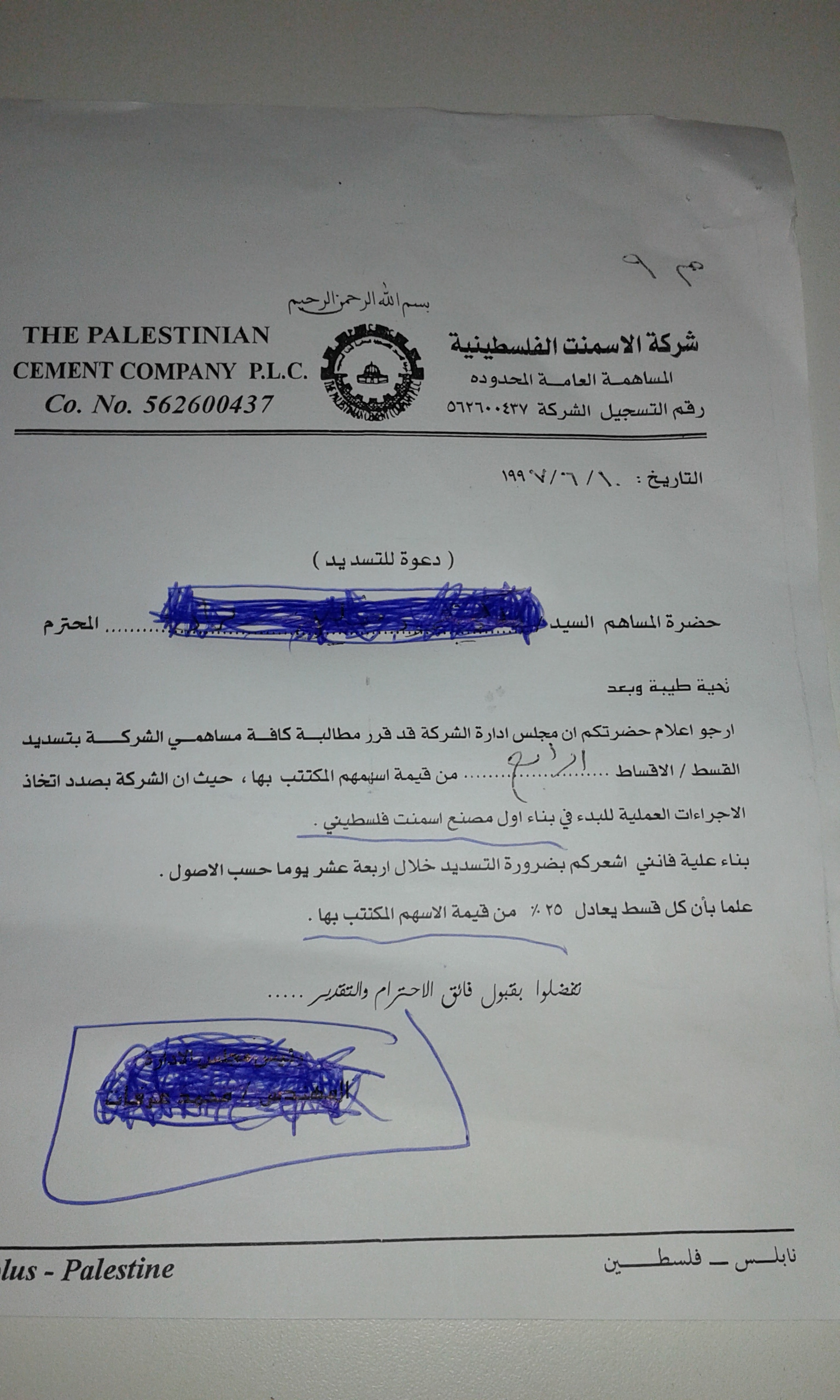 صورة عن كتاب رسمي من الشركة موجه للمساهيمن لدفع اقساط المساهمة.