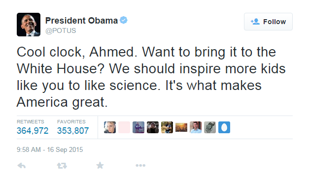 الحياة الجديدة- وكالات- مع ذيوع قصة اعتقال “المخترع الصغير” أحمد محمد وانتشار هاشتاغ #IStandWithAhmed على مواقع التواصل الاجتماعي، تفاعل الرئيس الأميركي باراك أوباما مع الطفل ذو الأصول السودانية من خلال تغريدة نشرها على تويتر تقول، "ساعة رائعة، ألا تحب إحضارها إلى البيت الأبيض يا أحمد ؟، يجب علينا إلهام المزيد من الأطفال الذين يحبون العلوم مثلك، هذا ما يجعل أمريكا عظيمة".