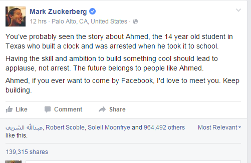 وكان اعتقال الشرطة الأميركية لأحمد أثار ردود فعل غاضبة من قبل رواد الشبكات الاجتماعية، الذين دشنوا الهاشتاغ، فكان على رأس المشاركين مؤسس موقع فيسبوك مارك زوكربيرغ، والذي كتب منشوراً على حسابه الشخصي، يدعو فيه أحمد لزيارته في مقر الشبكة الاجتماعية الضخمة.