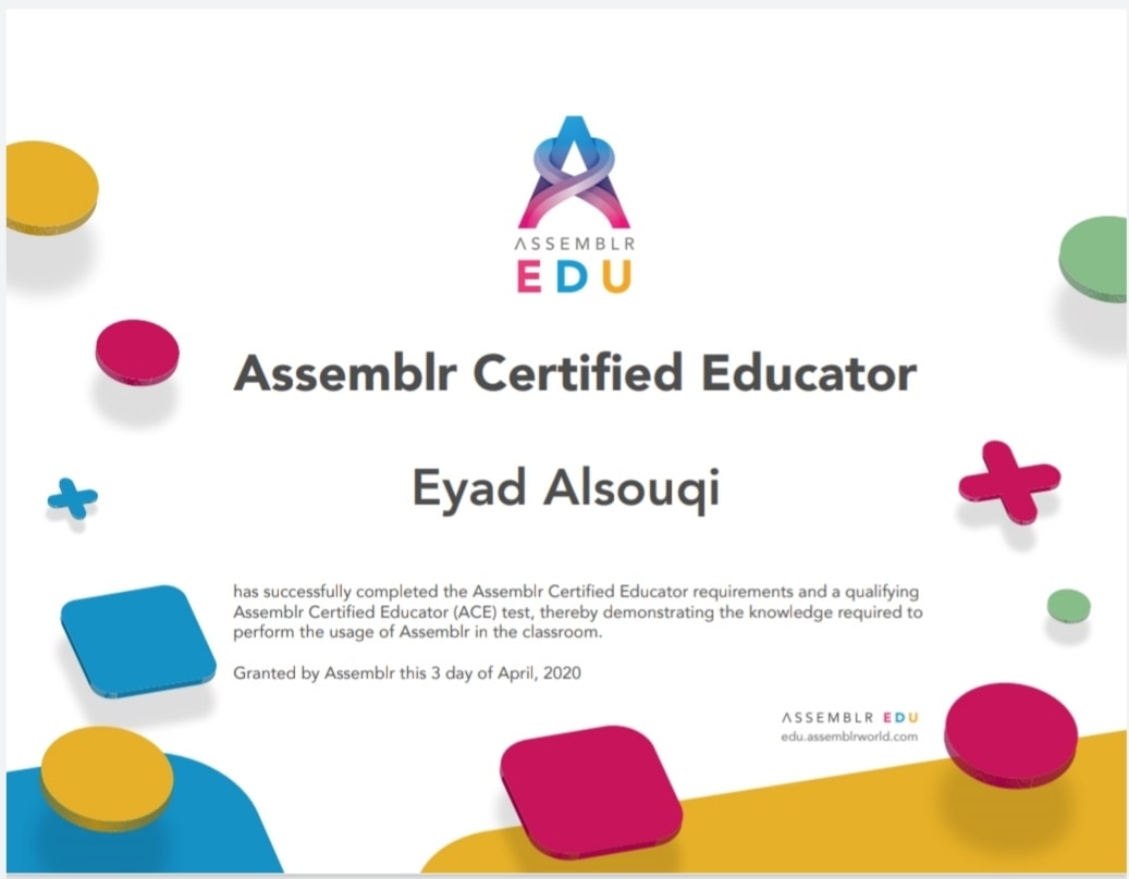 جنين-الحياة الجديدة-حصل الأستاذ إياد أحمد السوقي من جنين على شهادة المعلم المبتكر التي تمنحها منصة الابداع والابتكار العالمية المتخصصة في الواقع المعزز والافتراضي (Assemblr EDU)..