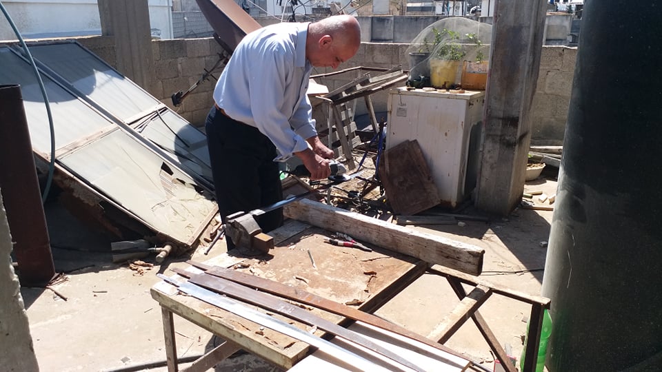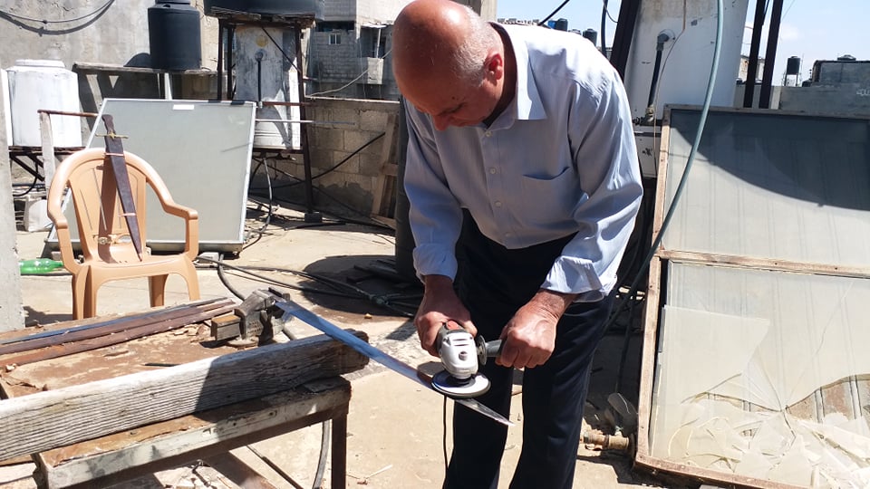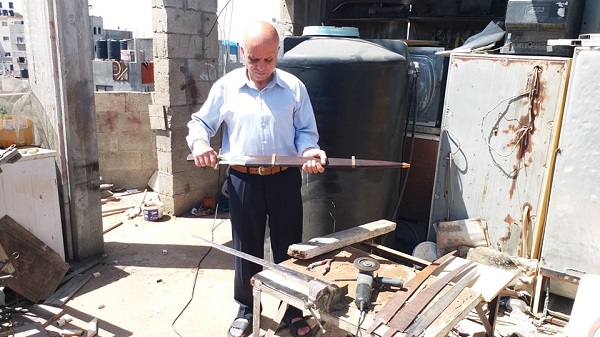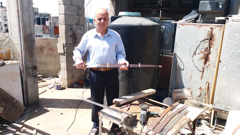 جمعة البالغ من العمر (63) عاما، أستاذ اللغة العربية في مدرسة أبو عبيدة بن الجراح شمال غزة، يسكن في منطقة الصفطاوي، قام بتحويل سطح منزله لورشة صغيرة يصنع فيها السيوف العربية.