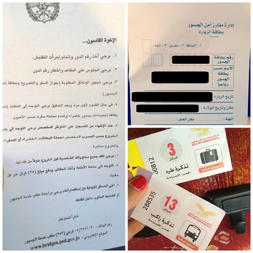 أحد الموجودين تنبّه من بعض المسافرين إلى أنه لم يدفع ضريبة الجسور (155 شيقل)؛ إذ تم تغيير مكان تحصيلها من داخل القاعة، إلى قاعة ثانية خارجها، اشترينا منها تذاكر الحقائب والباص أيضًا.