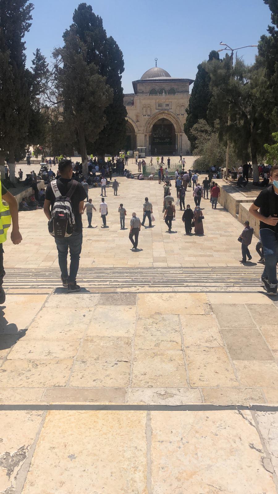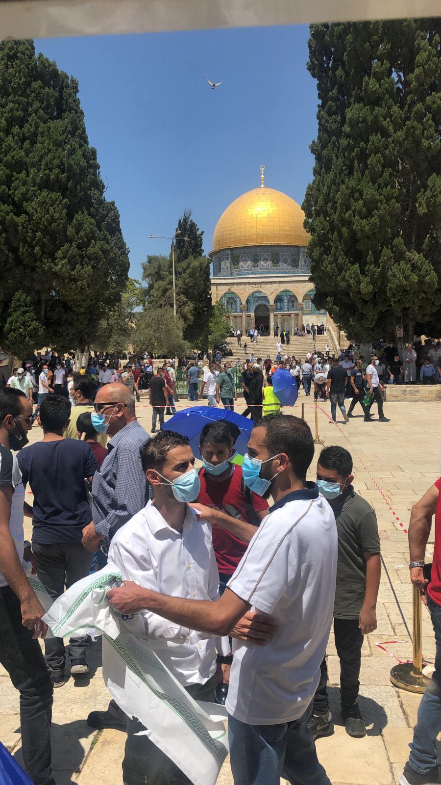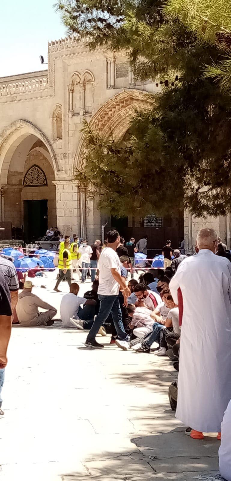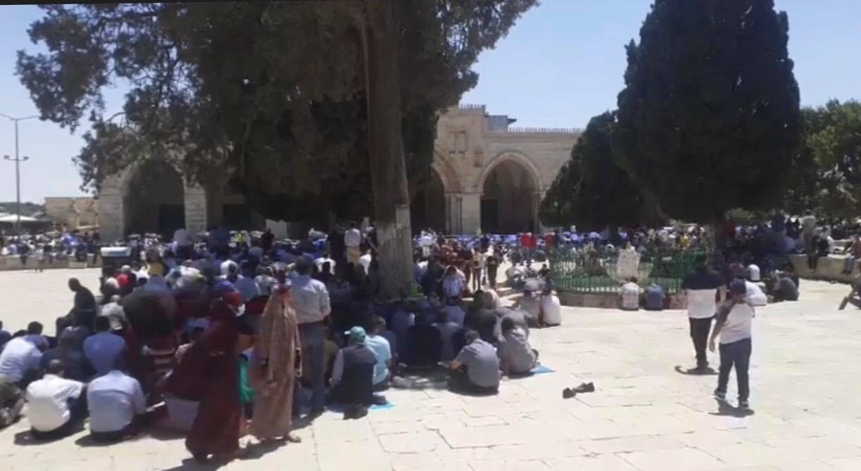 وكان نحو 10 آلاف مصلٍ أدوا صلاة الجمعة في رحاب المسجد الاقصى المبارك ضمن إتباع الوقاية من ارتداء الأقنعة الواقية والابتعاد مسافات بين كل مصلٍ وآخر وسط تشديدات شرطية اسرائيلية على أبوابه وفي محيط البلدة القديمة وتحت مراقبة الطائرة الاسرائيلية التي حامت في سماء المسجد الاقصى المبارك.