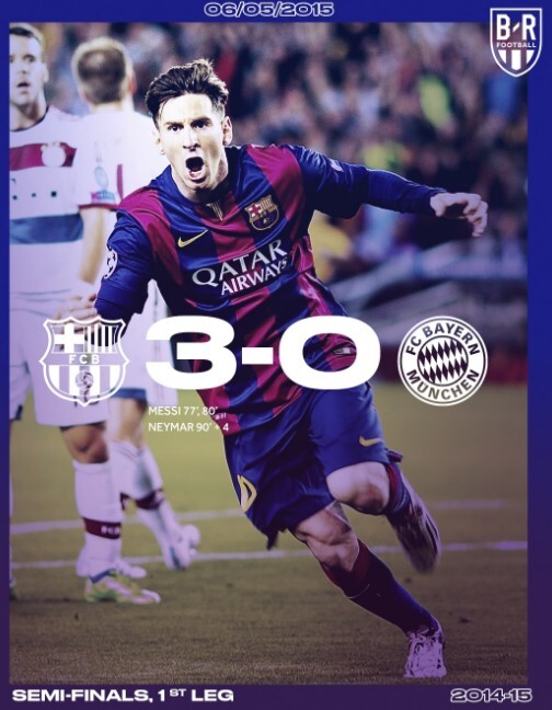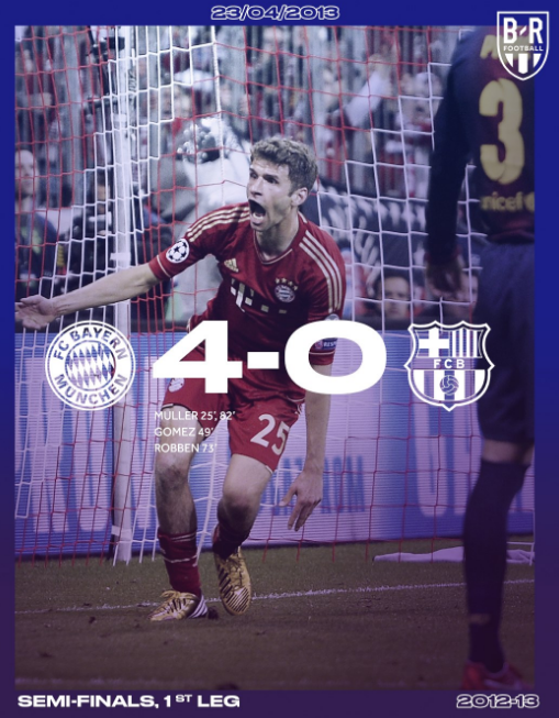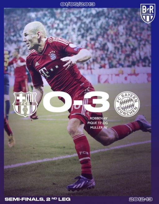 8- نصف نهائي دوري الأبطال 2012-2013 فاز البايرن بثلاثية نظيفة في مباراة الإياب في معقل برشلونة.