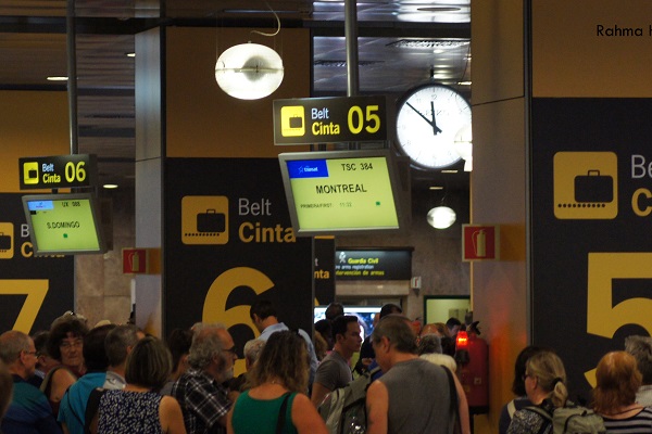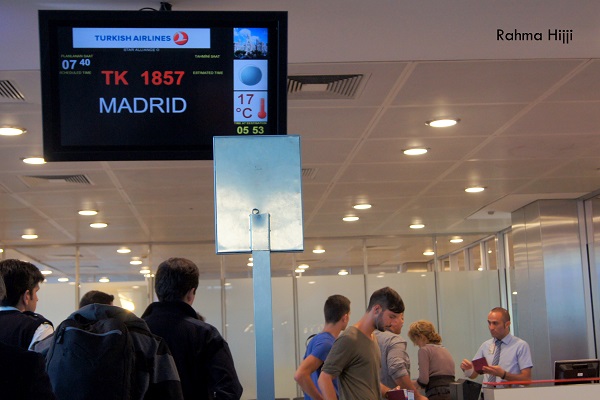 وفي تمام الساعة 7:40 صباحًا، بدأ فحص الجوازات للدخول إلى الطائرة من نوع " Airbus Industrie A330-200"، والشمس ترتفع شيئًا فشيئًا من بين الطائرات الساكنة والقادمة، ونحن هذه المرة لم نصل طائرتنا مباشرة، إذ هبطنا إلى باص بانتظارنا، ليُقلّنا إلى درج الطائرة المتوجهة إلى مدريد، كانت لحظةً حلم. تمنيتُ لو تسنّى لي التقاط صورة وأنا أصعد درج الطائرة، تمامًا كما في الأفلام، حيث تظهر نجمات السينما تصعده منهن من تمسك قبعتها العريضة كي لا تطير وأخرى فستانها، وتلوحن بأيديهنّ للمودعين.لا بأس، الــ"سيلفي" هي الحل.