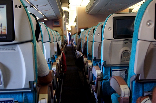 هذه المرة، جلستُ في مقعدٍ ظانةً أنني فهمت الترقيم، حتى أتت شرق آسيوية قالت لي إنني أجلس مكانها "بجانب النافذة"، ولم أطلب الانتقال، كي أجرّب الجلوس أقلّ قربًا من النافذة. ويبدو أنها معتادةٌ على السفر لأنها أغلقت النافذة مرات عدة كي تنام، بينما ظللت أنتظرُ الغيوم لالتقاط الصور.