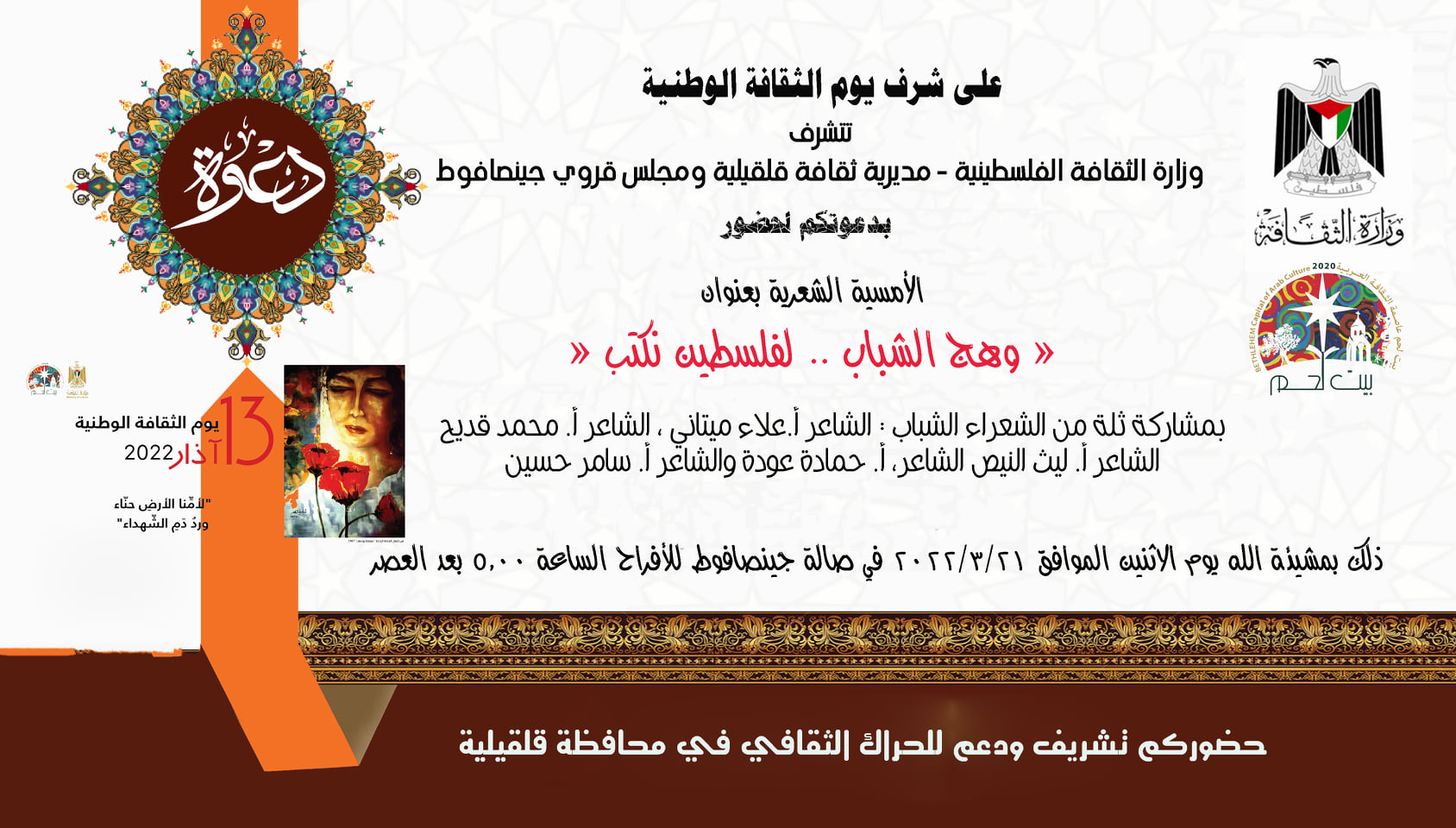 قلقيلية: أمسية شعرية بعنوان "وهج الشباب ... لفلسطين نكتب"