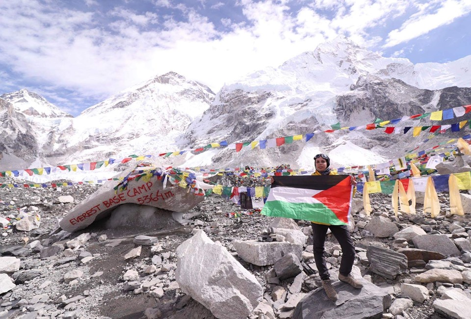 طالبة من "القدس المفتوحة" ترفع علم فلسطين عالياً من قاعدة مخيم جبل إيفريست